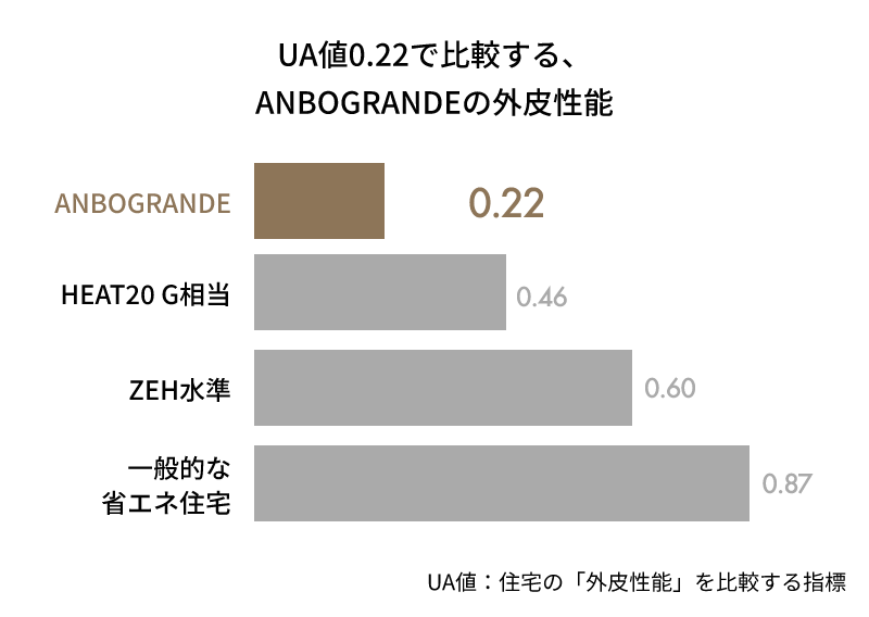 ANBO GRANDE では、断熱性能を感覚的な表現ではなく、数値として確認できるよう外皮性能を整理しています。