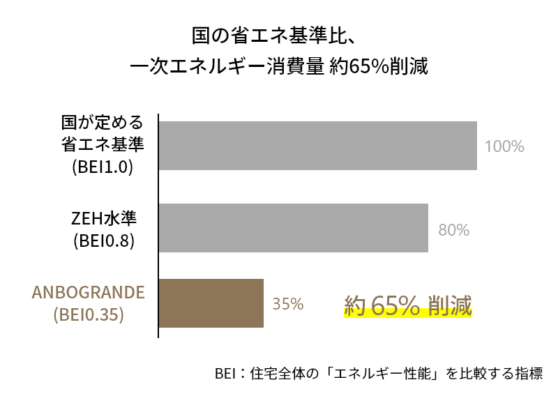 ANBO GRANDEでは、住宅全体で使用される一次エネルギー消費量について、国の省エネ基準と比較した結果、約65%削減となる設計水準を確認しています。