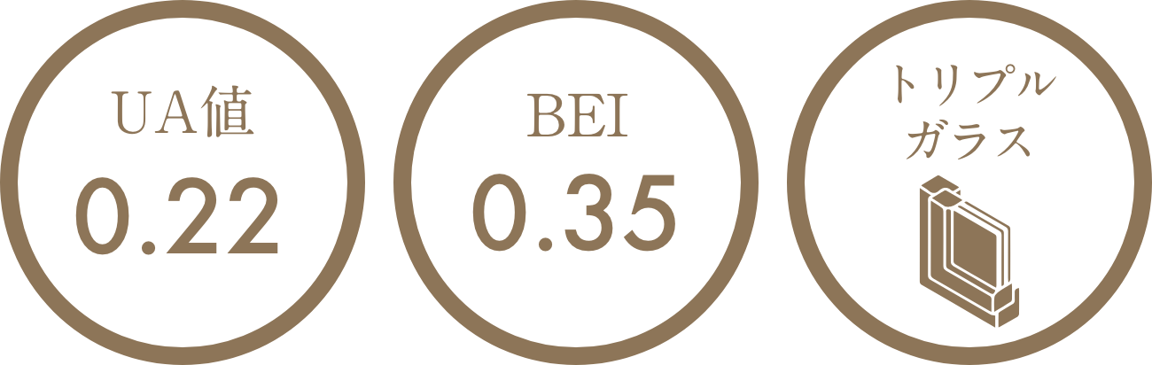 ANBO GRANDEでは、断熱等級7を見据え、トリプルガラスを採用。開口部からの熱損失を抑えることで、UA値0.22という外皮性能や、BEI0.35という省エネ性能の実現につなげています。